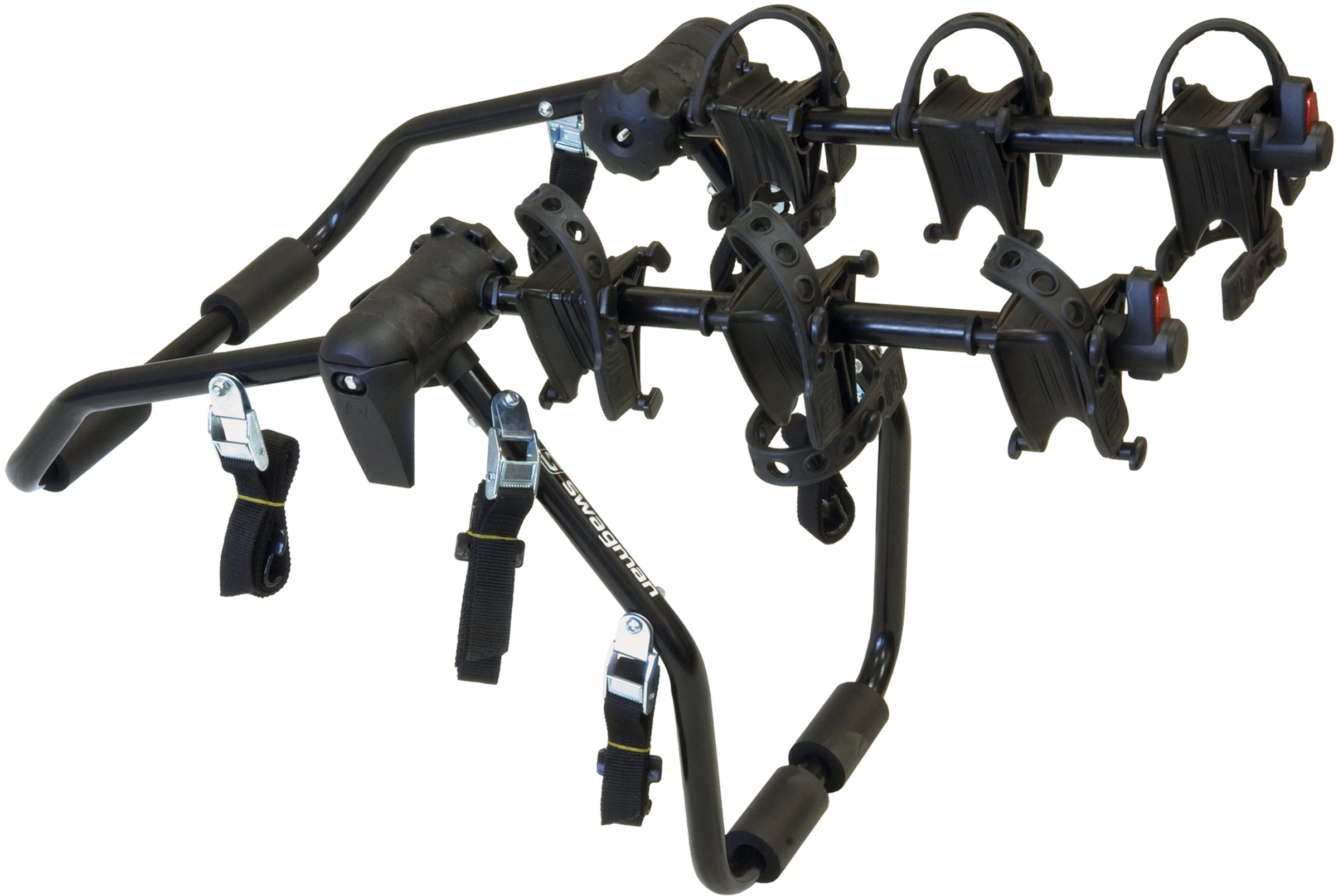 Swagman's ST One 3-Bike Trunk Rack is an easy-to-use, versatile, and sturdy steel rack that carries up to 3 bicycles. A 3-way adjustable cam-and-lever mechanism with 6 straps adapts and secures the rack to most coupes, mini-vans, sedans and hatchbacks. Soft, conforming, protective anti-sway cradles safely hold your bicycles by their frames and prevent bike-to-bike contact. The ST One folds for easy storage when not in use.